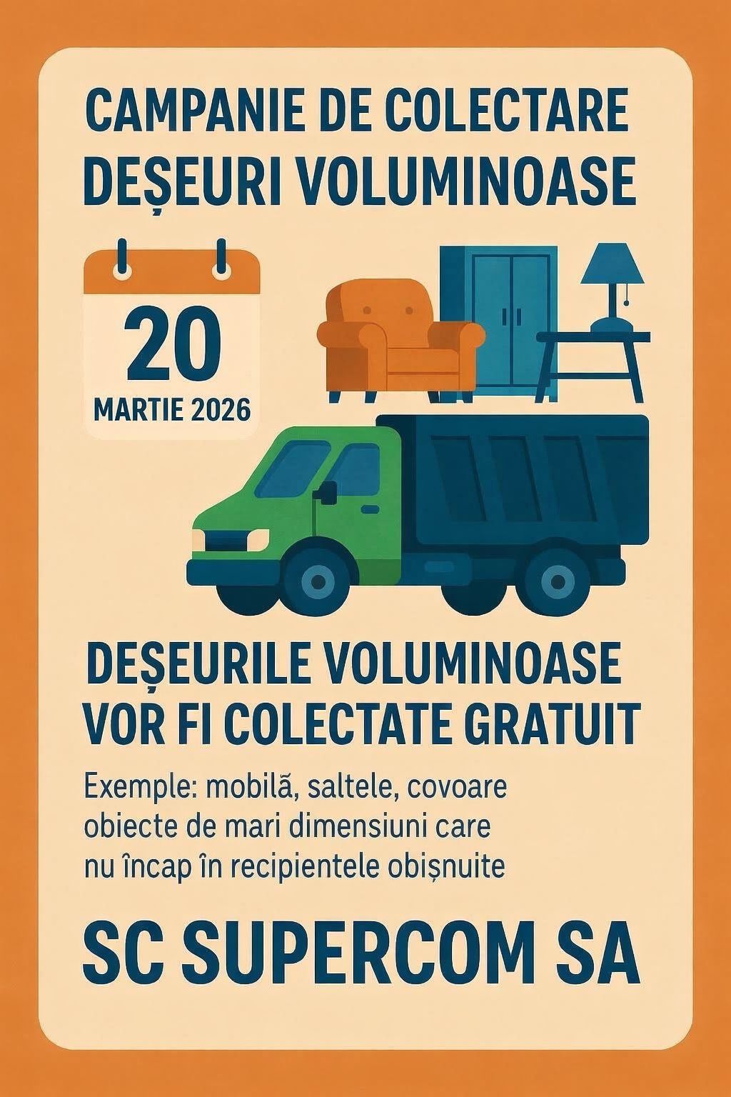 Operatorul SC SUPERCOM SA anunță organizarea unei acțiuni de colectare a deșeurilor voluminoase vineri, 20 martie 2026, în municipiul Deva.