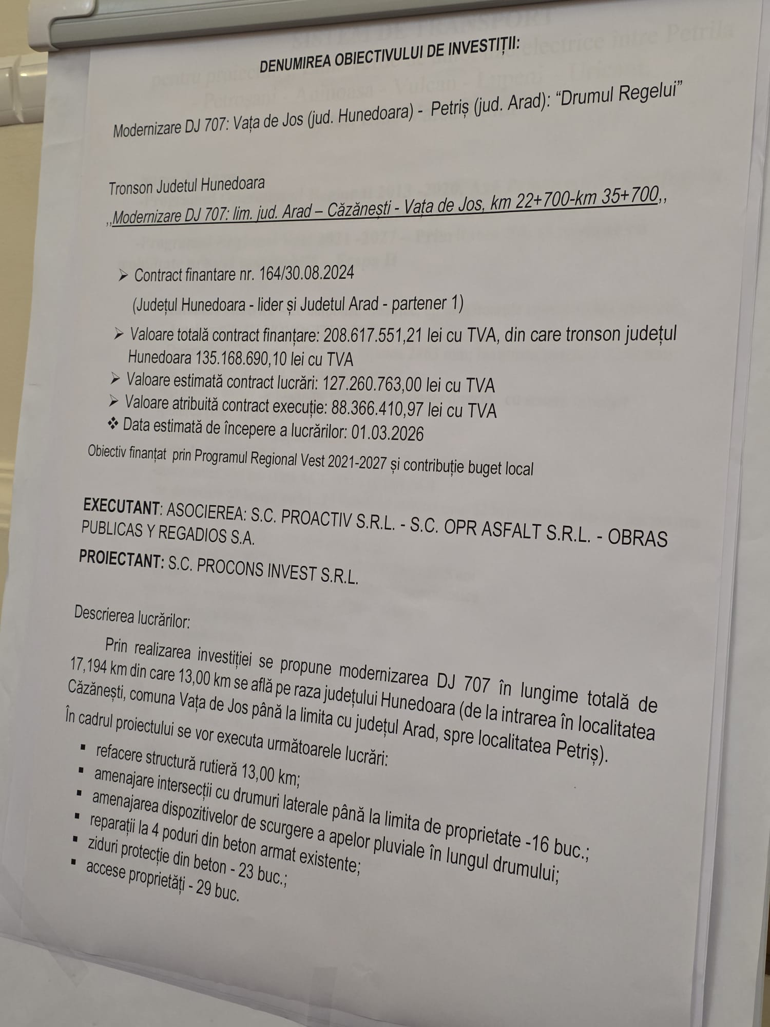 Consiliul Județean Hunedoara a semnat astăzi contractul de execuție pentru modernizarea DJ 707, cunoscut drept „Drumul Regelui”, pe tronsonul dintre Vața de Jos și limita cu județul Arad, în cadrul unei conferințe de presă organizate la sediul instituției.