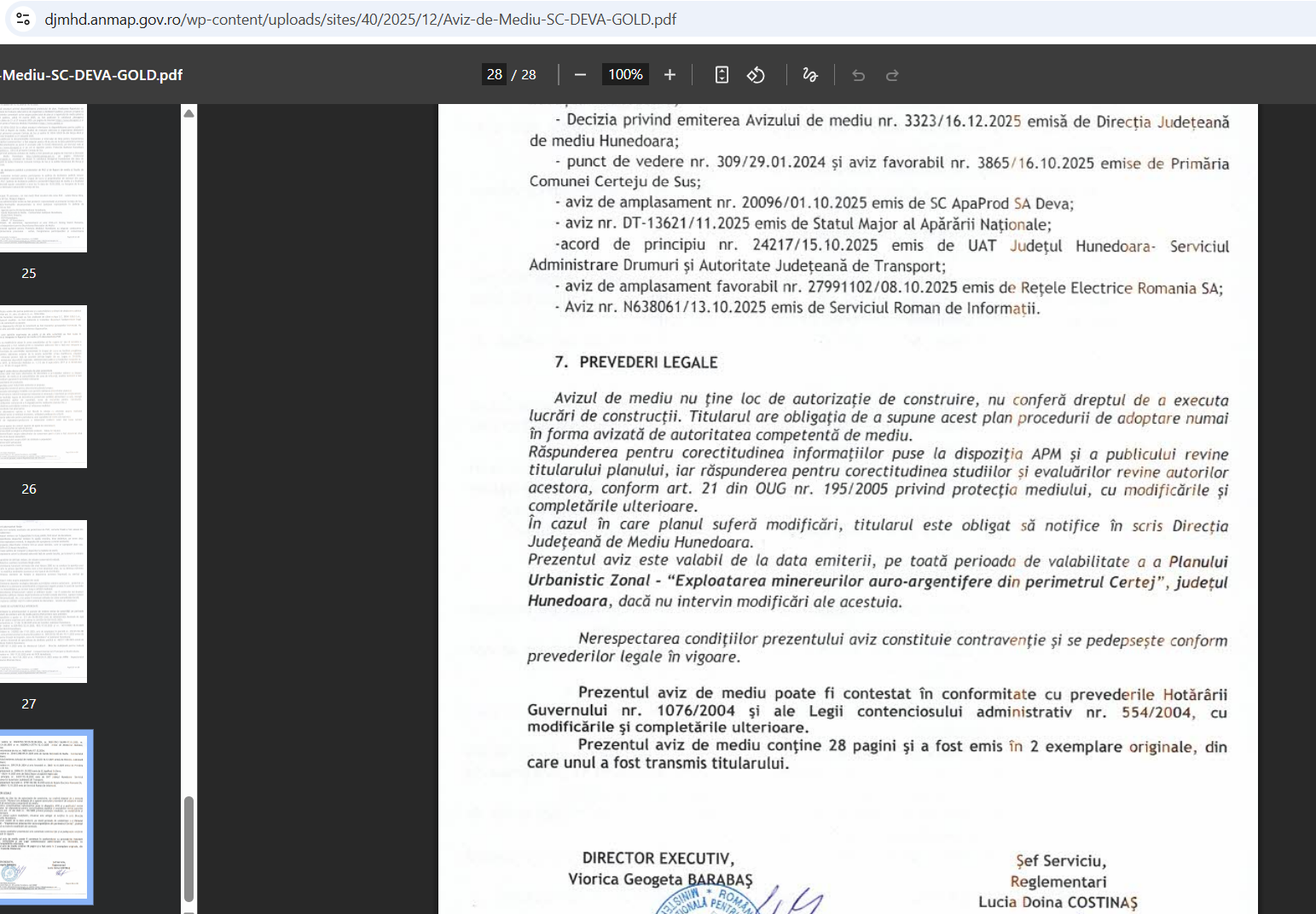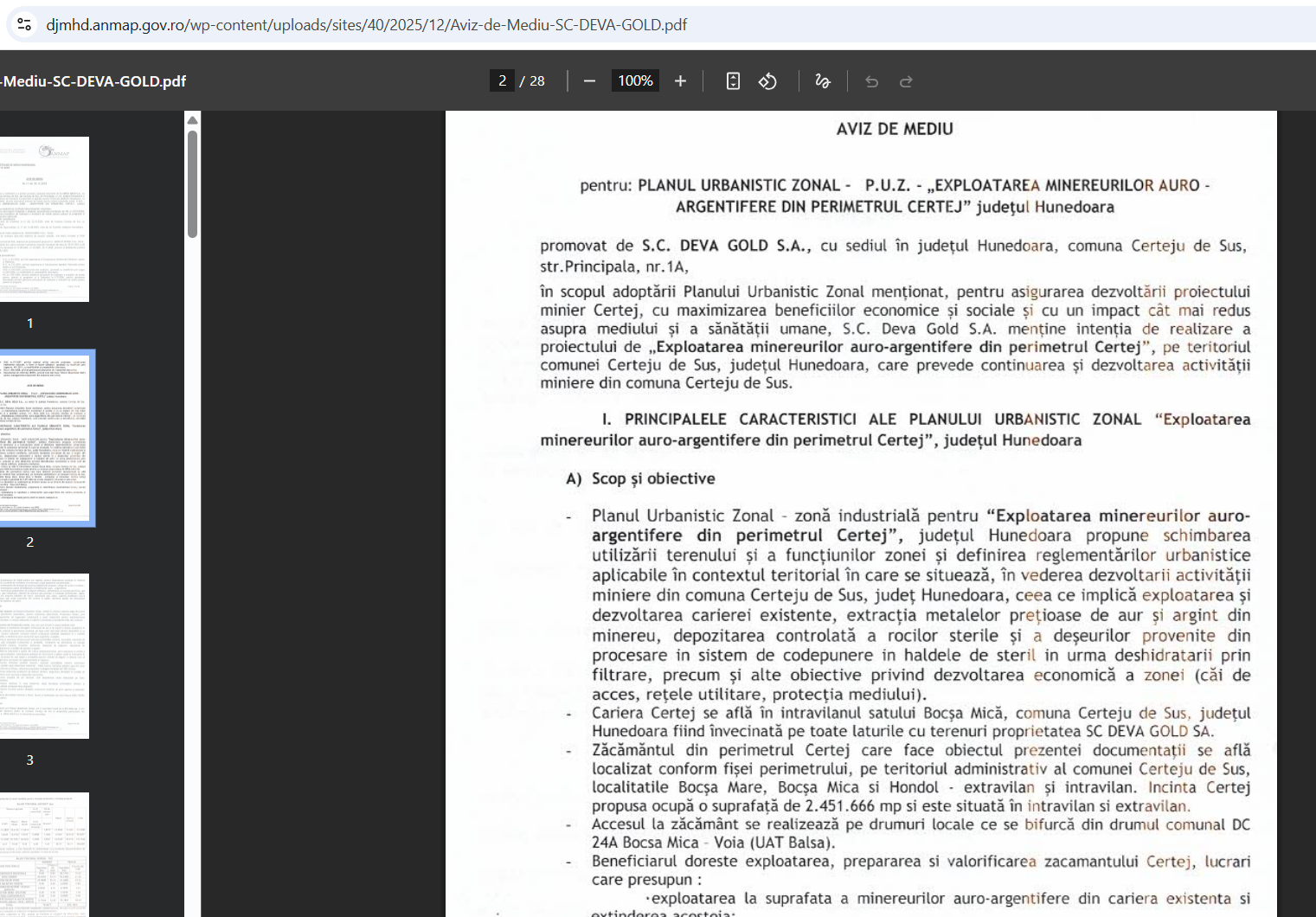 Pe site-ul Direcției Județene de Mediu este publicat acest aviz de mediu, care poate fi vizualizat de orice persoană interesată. În aviz, este precizat clar că „Avizul de mediu nu ține loc de autorizaţie de construire, nu conferă dreptul de a executa lucrări de construcții”. AVIZ DE MEDIU este pentru „PLANUL URBANISTIC ZONAL – P.U.Z. – EXPLOATAREA MINEREURILOR AURO -ARGENTIFERE DIN PERIMETRUL CERTEJ judeţul Hunedoara”.