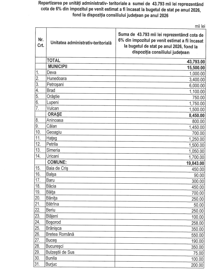 Consiliul Județean Hunedoara a aprobat repartizarea sumei de aproximativ 43.8 de milioane de lei către unitățile administrativ-teritoriale, bani proveniți din cota de 6% din impozitul pe venit estimat pentru anul 2026. Fondurile sunt destinate dezvoltării locale, cofinanțării proiectelor de infrastructură și acoperirii unor cheltuieli de funcționare.