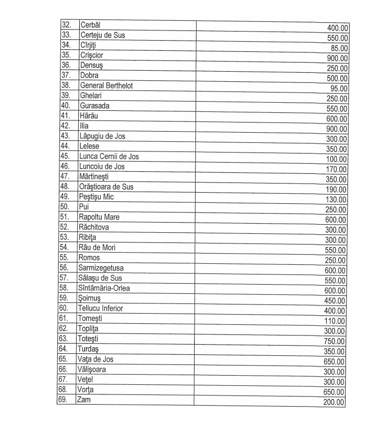 Vreau să vă informez că, în total, am primit 43.793 mii lei, și au fost solicitați în scris, de către primarii județului Hunedoara, indiferent de coloratura politică, 473.345 mii lei. Cam de 10 ori mai mult. Îmi spun mie că am chemat primarii doar să le spun o decizie deja luată? Să-i fie rușine celui care a scris așa ceva! A fost o discuție foarte-foarte aplicată cu toți primarii din județ. Fiecare a venit cu banii pe care i-a solicitat. Ba mai mult, dragi colegi, suma aceasta – de 43.793 – am împărțit-o la total populație județ și rezultă că, pe un locuitor, se pot acorda 0,121. Am luat și de la Trezorerie, pentru a vedea cât mai primește fiecare coleg al nostru primar. Vă dau un exemplu, Vulcan. Vulcanul mai primește de la Trezorerie 2.845 (mii lei). În funcție de cât au primit fiecare, în funcție de ce proiecte au fiecare, pentru care au nevoie de cofinanțare, am încercat prin echilibrarea noastră să fie câtuși de apropiată de nevoile reale, nu de solicitările lor.