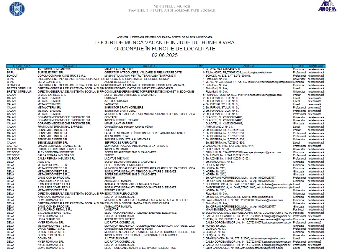 Agenția Județeană pentru Ocuparea Forței de Muncă Hunedoara a făcut publică lista locurilor de muncă vacante în județ, în luna iunie, atât la stat, cât și la privat. Sunt vacante sute de joburi, în județul Hunedoara, în mai multe domenii.
