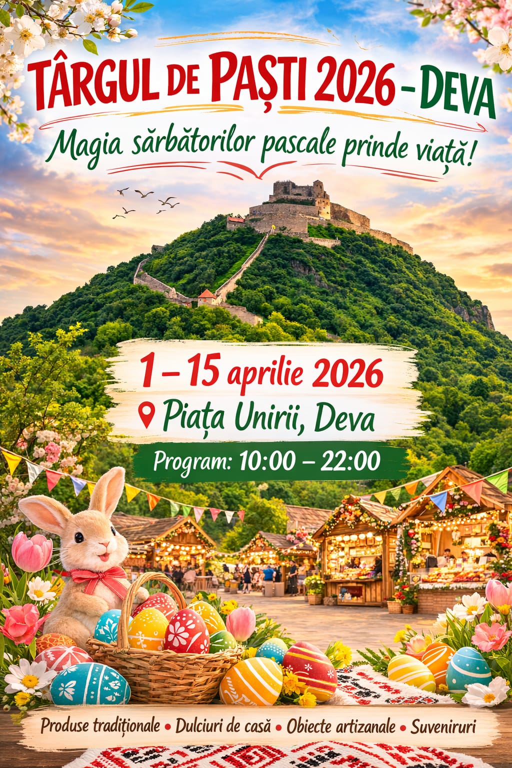 Primăria Municipiului Deva anunță organizarea ediției din acest an a Târgului de Paști, eveniment care va avea loc în perioada 1 – 15 aprilie 2026, în Piața Unirii.